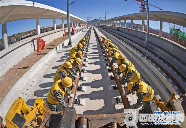 中鐵十九局工程人員在京沈高鐵凌源南站進行鋪軌作業(yè)(9月28日攝)。京沈高鐵起自北京星火站,經(jīng)河北省承德市、遼寧省朝陽市、阜新市接入沈陽站,線路全長698公里,設(shè)計時速350公里。