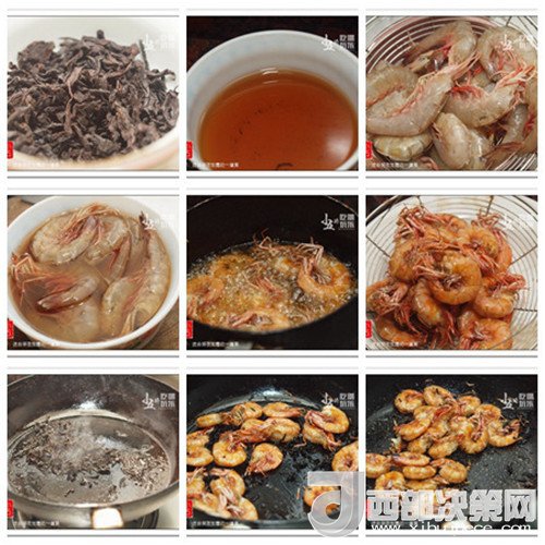 準備好烏龍茶;加入開水沖泡,第一泡茶水倒掉,其他的茶水沖在碗里,茶葉瀝干水分待用;海蝦去除蝦頭,蝦背剪開;將蝦放入茶水中,浸泡1個小時,撈出瀝干水分;熱油,下蝦,用中火炸至蝦金黃;取出,再快速復炸一遍,瀝干油;取一平底鍋,下1湯匙左右的油,溫度足夠時,下茶葉,用中小火炒出茶葉的香味;下蝦,繼續(xù)用中小火炒均勻,炒至蝦變熱;加入椒鹽粉調味,即可熄火。