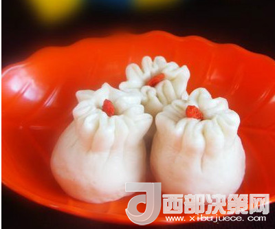 5、將圓片四周捏在一起做成生坯;在生坯上點綴枸杞,醒20分鐘,蒸15分鐘即可。