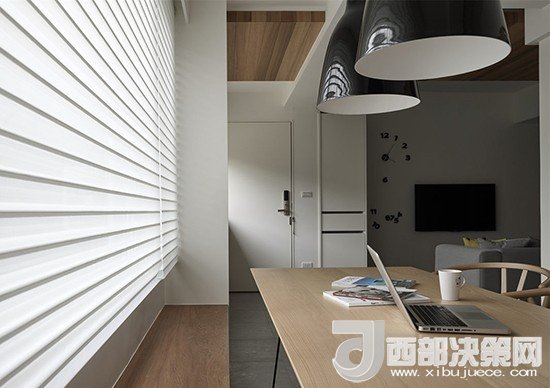 為了符合簡單純粹的設(shè)計理念,沒有電視柜的背景墻上放置了一個藝術(shù)時鐘,可移動的數(shù)字設(shè)計展現(xiàn)了一種道家的精神。