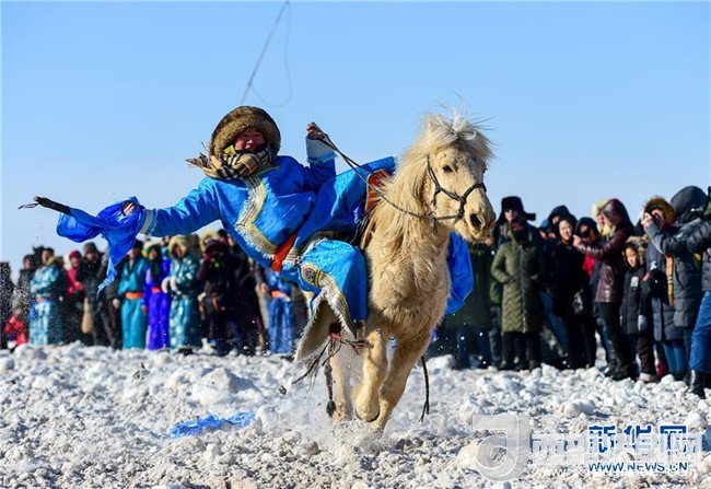 1月16日,在內(nèi)蒙古錫林浩特鳳凰馬場,當(dāng)?shù)啬撩癖硌萏遵R。