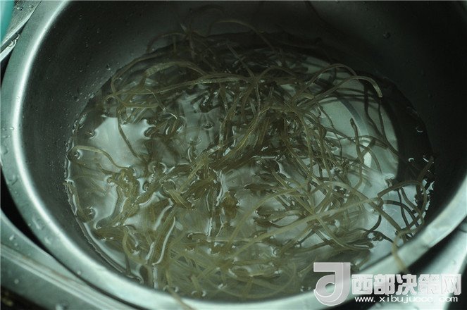 2.紅薯粉放入開(kāi)水中泡發(fā)十分鐘左右,當(dāng)紅薯粉絲變軟后撈出來(lái)瀝干水