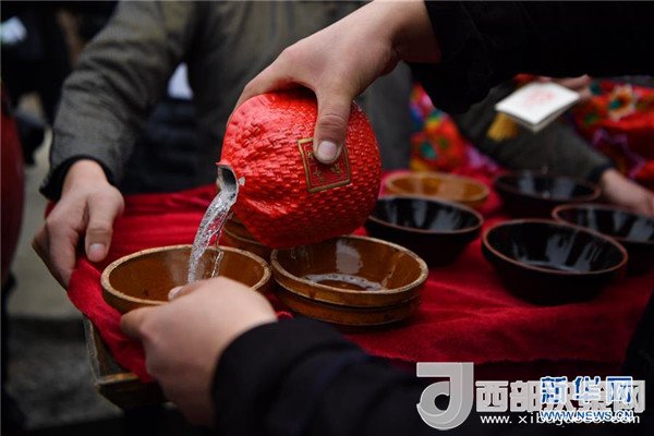2月4日,在湖南省湘西土家族苗族自治州花垣縣十八洞村,新娘的親友為接親隊(duì)伍倒上攔門酒。