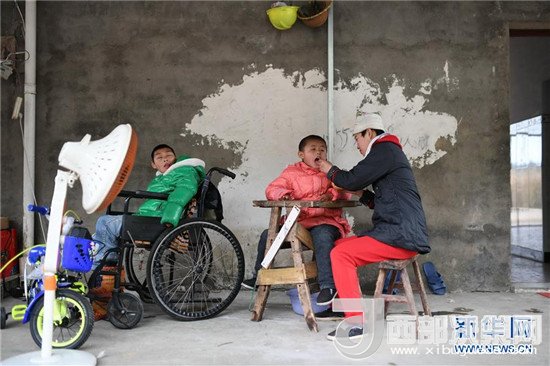 饒梅香代養(yǎng)的三個(gè)孩子在屋外曬太陽(2月14日攝)。