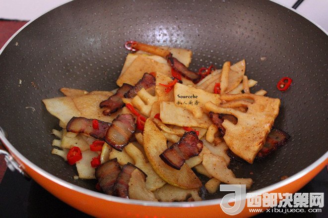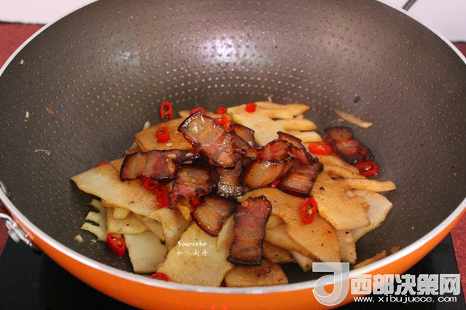6.放入切好的辣椒、煎好的臘肉;