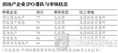 據(jù)中國(guó)證監(jiān)會(huì)最新公布的《發(fā)行監(jiān)管部首次公開(kāi)發(fā)行股票審核工作流程及申請(qǐng)企業(yè)情況》顯示,截至2018年2月22日,證監(jiān)會(huì)受理首發(fā)企業(yè)438家,其中,已過(guò)會(huì)27家,未過(guò)會(huì)411家。未過(guò)會(huì)企業(yè)中正常待審企業(yè)404家,中止審查企業(yè)7家。其中,在“涉房”企業(yè)中萬(wàn)達(dá)商業(yè)地產(chǎn)、富力地產(chǎn)、同策房產(chǎn)咨詢(xún)、金輝集團(tuán)、首創(chuàng)置業(yè)等繼續(xù)保持“已反饋”狀態(tài)。按照申報(bào)企業(yè)排序,分別位列77、78、79、80、86名。