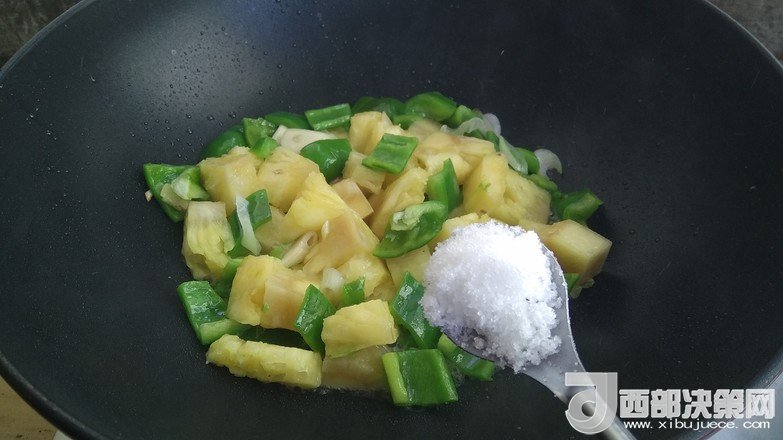 3.菠蘿肉切塊,青椒切塊,蔥姜蒜備用
