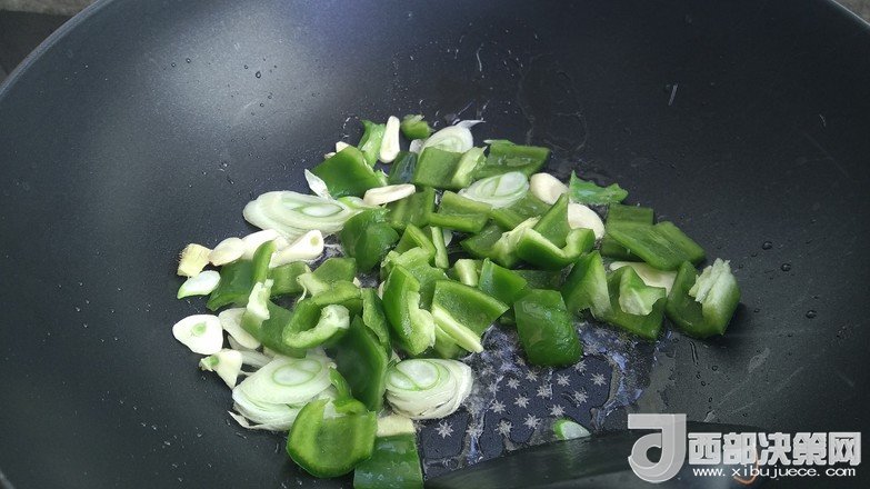 輔料料:酒5 克 胡椒粉 1克 淀粉 15克 青椒 1個(gè) 蔥白 3克 蒜片 3克 姜末 1克 生抽 2克 鹽 3克 白糖 5克