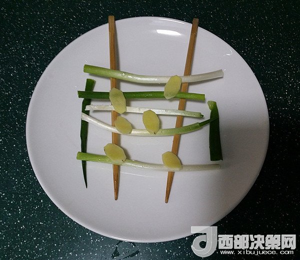 4.取一大盤子上面架起一雙筷子、放上洗凈的蔥段和姜片,也是達(dá)到去腥增香的作用