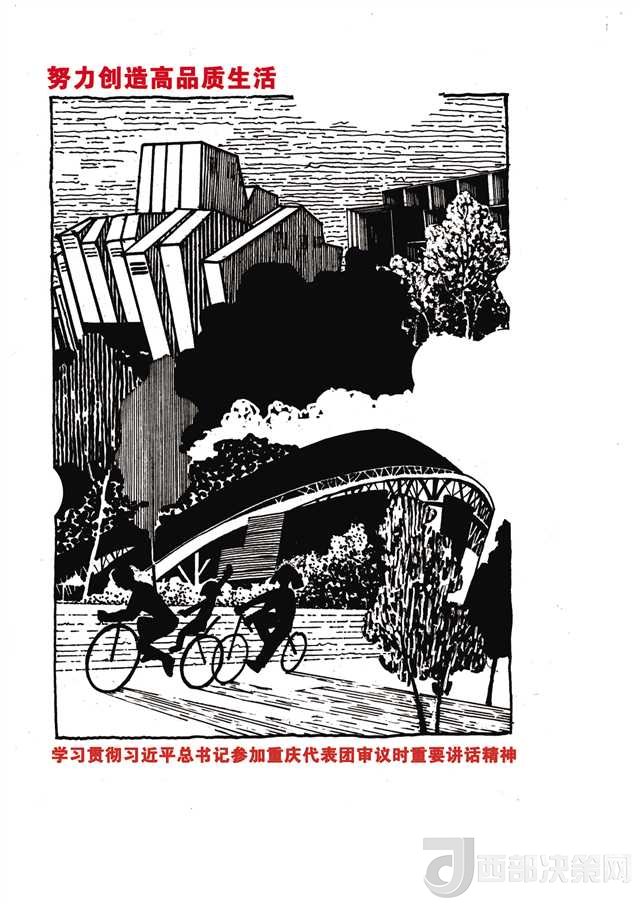 另一組負責“創(chuàng)造高品質生活”的師生也遭遇類似的問題。最初師生們想用一組市民在公園鍛煉的場景來闡述這個主題,但很快就發(fā)現這樣的畫面太簡單蒼白。最終,他們將重慶大劇院、重慶美術館、奧體中心等重慶的標志性建筑作為文化符號列入畫稿中,才有了令人耳目一新的感覺。