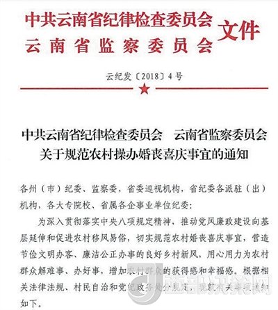 近日,云南省紀委、監(jiān)察委下發(fā)了《關于規(guī)范農(nóng)村操辦婚喪喜慶事宜的通知》(下稱《通知》),明確云南省農(nóng)村地區(qū)除為本人及子女操辦婚事,為直系親屬操辦喪事外,一律不操辦客事。