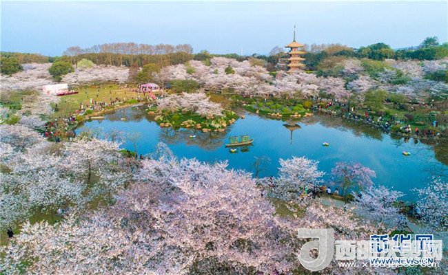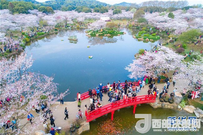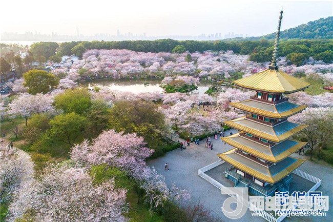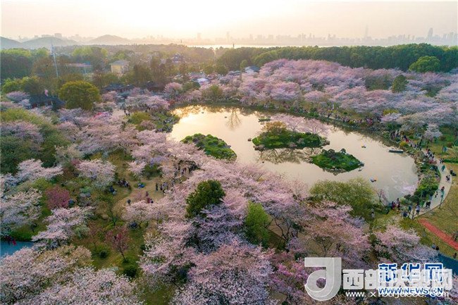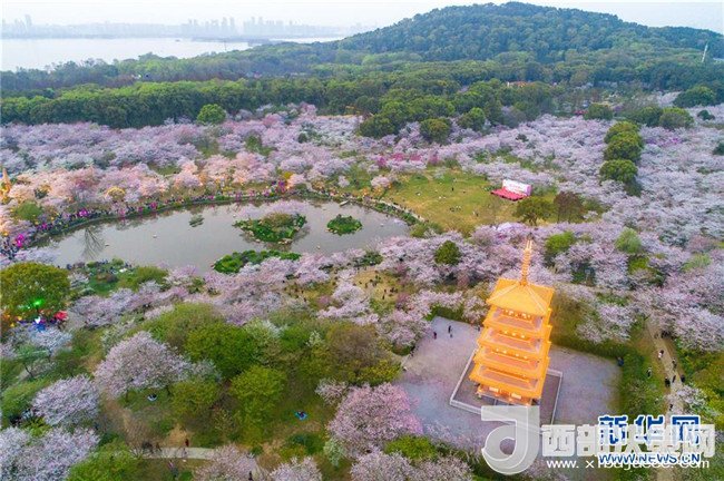 3月26日無人機(jī)拍攝的武漢東湖櫻花園。