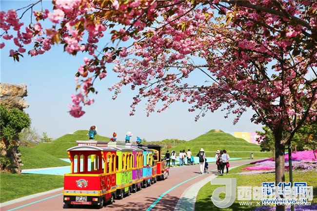 4月8日,觀光小火車行駛在江蘇南通洲際綠博園。