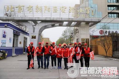 北京市朝陽區(qū)實驗小學(xué)雄安校區(qū),參加“家校警”護學(xué)隊的當?shù)丶议L志愿者在校門口。