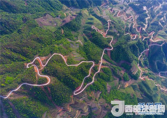 這是借助無人機拍攝的融水苗族自治縣桿洞鄉(xiāng)錦洞村公路(4月17日攝)。