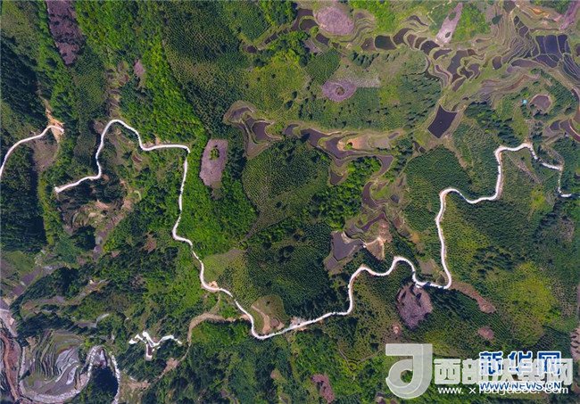 這是借助無人機拍攝的融水苗族自治縣桿洞鄉(xiāng)黨鳩村公路(4月17日攝)。