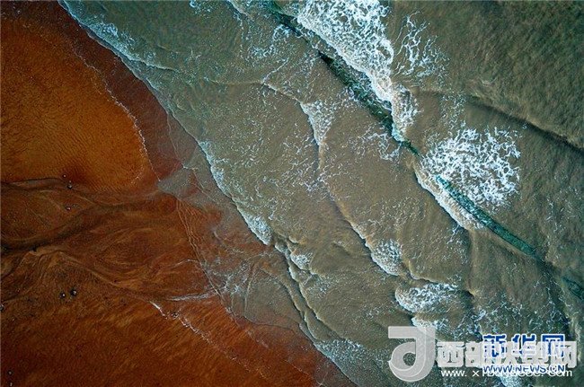 5月16日無人機(jī)航拍的霞浦沿海灘涂海浪沖刷沙灘的美景。