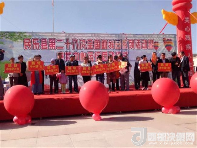 在活動(dòng)現(xiàn)場(chǎng),為殘疾人代表捐贈(zèng)了由甘肅省殘疾人福利基金會(huì)、市殘聯(lián)捐贈(zèng)的凈水器100臺(tái),為200名不能行走的殘疾人捐贈(zèng)了價(jià)值9.6萬(wàn)元的輪椅,為各鎮(zhèn)和社管委捐贈(zèng)了由澳大利亞魏基成天籟列車捐贈(zèng)的價(jià)值100多萬(wàn)的助聽(tīng)器180臺(tái),為全縣185名殘疾學(xué)生代表每人發(fā)放了助學(xué)金500元。