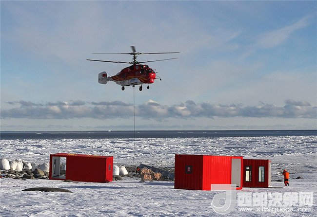 船載“雪鷹12”Ka——32直升機(jī)將物資吊運(yùn)至恩克斯堡島新建站區(qū)(2017年12月9日攝)。新華社記者 白國龍 攝