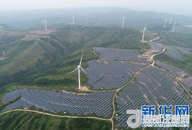 這是黃龍縣界頭廟鎮(zhèn)的風力發(fā)電場和光伏發(fā)電項目(6月1日無人機拍攝)。新華社記者邵瑞攝