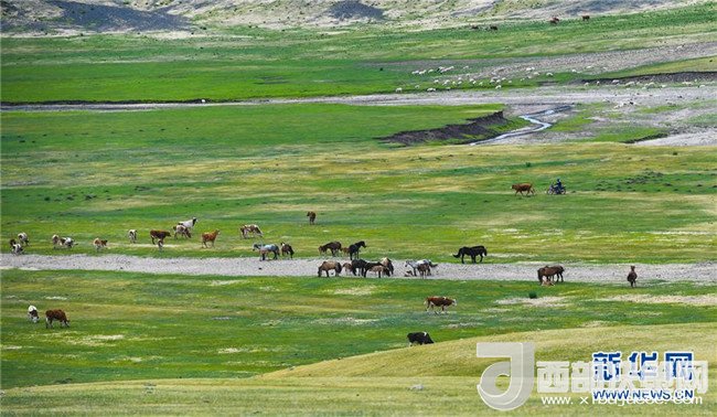 6月6日,牲畜在內(nèi)蒙古赤峰市阿魯科爾沁草原上覓食。 新華社記者 彭源 攝