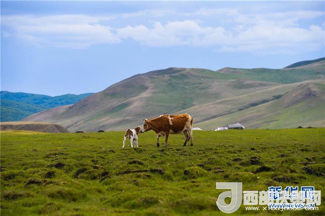 6月6日,母牛帶著小牛在內(nèi)蒙古赤峰市阿魯科爾沁草原上覓食。 新華社記者 彭源 攝