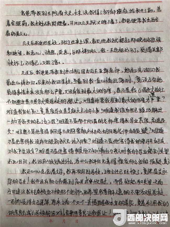 在與李某奕父親了解的過程中得知,雖然父母離異但并未影響她的學(xué)習(xí),不像網(wǎng)友猜測(cè),她是因?yàn)楦改鸽x異患抑郁癥的。李某奕在校學(xué)習(xí)期間(事發(fā)之前)非常刻苦,她一直夢(mèng)想報(bào)考新聞傳媒專業(yè),且經(jīng)常參加學(xué)校的各種活動(dòng)并擔(dān)任主持人。但一切就從班主任吳某厚的獸行之后開始改變了。從患病開始她一直堅(jiān)持要上學(xué),但由于吃藥的緣故她不能正常的上課,加之長(zhǎng)期的治療也落下不少功課,最后由于身體和心理原因,她感覺力不從心。中途三次試圖吃大量鎮(zhèn)定類、抑郁類藥物想要結(jié)束自己的生命,都被及時(shí)搶救了下來。在她的控訴書中有一段:“明明該像鮮花一樣美好的年齡,我卻不知道為什么人要活著?明明比金銀還寶貝的時(shí)間剩了那么一點(diǎn)點(diǎn),我卻不得不中斷學(xué)習(xí),而是給自己找活下去的理由。終日伴著眼淚入睡,時(shí)常被嚇醒,這個(gè)世界上沒有什么比自己都不知道自己什么時(shí)候發(fā)神經(jīng)尋死,自己努力為自己找活下去的理由更讓人覺得痛苦。而這一切都是我那曾經(jīng)的老師和信任的學(xué)校造成的。”從實(shí)際了解和李某奕控訴書中的描寫,她整日活在焦慮、恐懼、痛苦之中,這樣的生活離她的大學(xué)夢(mèng)想越來越遠(yuǎn),直至破滅。
