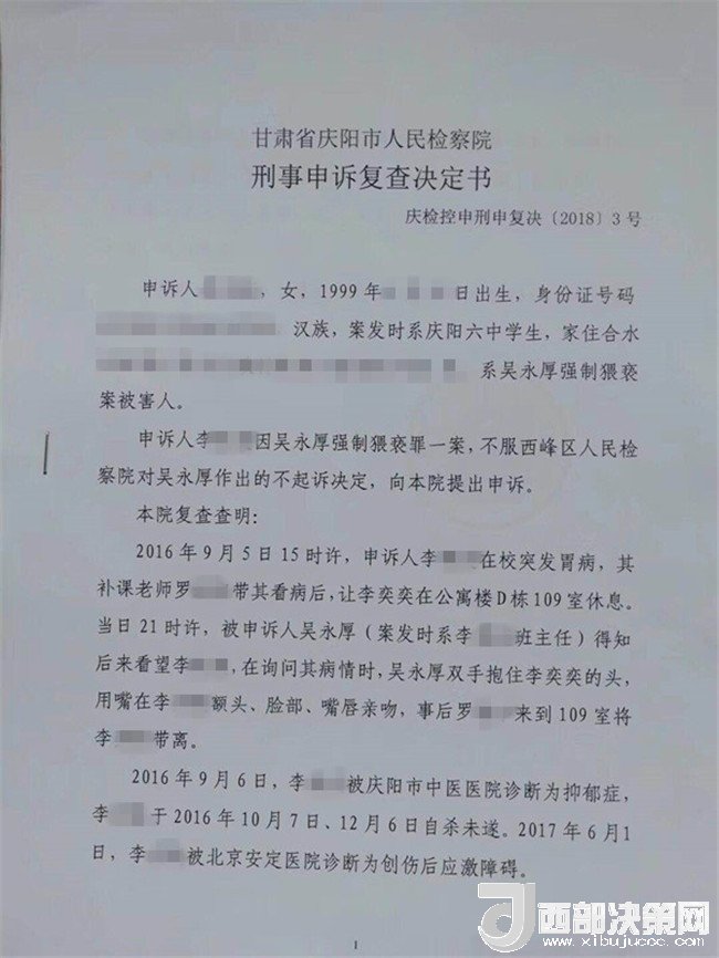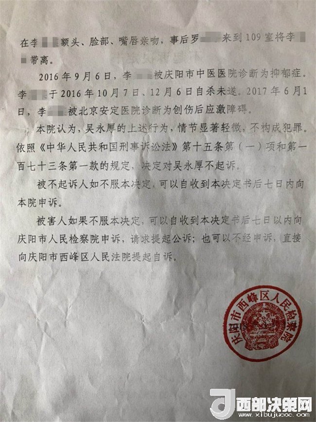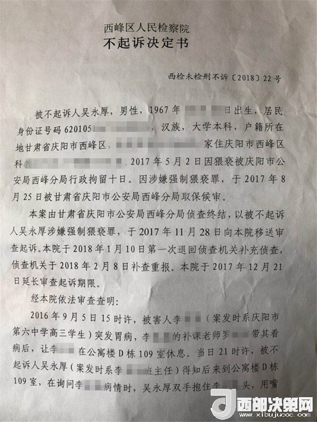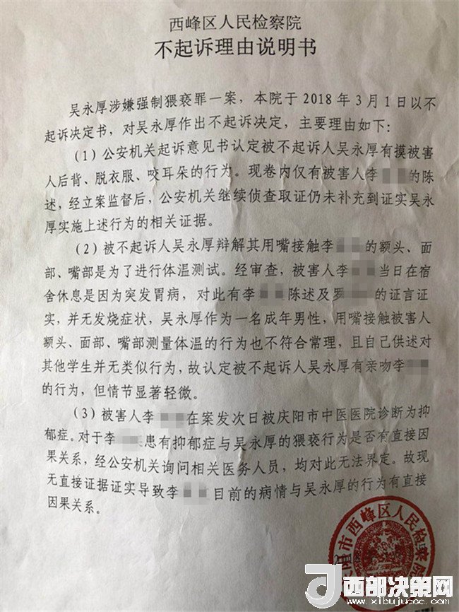 2017年2月26日,李某奕在父親陪同下到公安機(jī)關(guān)報(bào)案,稱被其班主任吳某厚猥褻,要求查處。經(jīng)辦案部門調(diào)查,2017年5月2日,公安機(jī)關(guān)依據(jù)《中華人民共和國(guó)治安管理處罰法》第四十四條之規(guī)定,以猥褻行為對(duì)吳某厚處以行政拘留十日處罰。其間,李某奕父親認(rèn)為公安局處罰不當(dāng),到西峰區(qū)人民檢察院進(jìn)行申訴。區(qū)檢察院調(diào)閱案卷后認(rèn)為吳某厚的行為涉嫌犯罪,書面通知公安局立案?jìng)刹椤9簿钟?017年8月10日立為刑事案件。8月25日對(duì)吳某厚采取取保候?qū)彺胧?1月20日偵查終結(jié)后移送起訴至區(qū)檢察院。區(qū)檢察院審查后認(rèn)為吳某厚的行為“情節(jié)顯著輕微,不構(gòu)成犯罪”,“決定對(duì)吳某厚不起訴”,并出具《不起訴理由說明書》。提出不起訴的三個(gè)理由,包括“公安機(jī)關(guān)繼續(xù)偵查取證仍未補(bǔ)充到吳某厚實(shí)施上述行為的相關(guān)證據(jù)”、“吳某厚有親吻李某奕的行為,但情節(jié)顯著輕微”、“無(wú)直接證據(jù)證實(shí)導(dǎo)致李某奕目前的病情與吳某厚的行為有直接因果關(guān)系”,于2018年3月1日作出不起訴決定。李某奕遂到慶陽(yáng)市人民檢察院進(jìn)行申訴。5月18日,市檢察院維持區(qū)檢察院不起訴決定。6月25日晚,據(jù)李某奕父親講,他已將申訴材料寄至甘肅省人民檢察院。