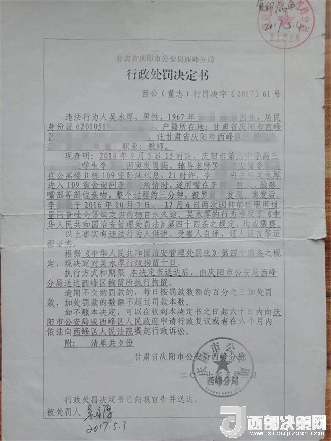 孩子叫李某奕,1999年4月出生,原慶陽(yáng)六中高三(二)班學(xué)生,平時(shí)活潑開朗,勤奮好學(xué),成績(jī)?cè)诎嗉?jí)前列。然而,噩夢(mèng)從2016年9月開始了。2016年9月5日下午,當(dāng)時(shí)正在慶陽(yáng)六中讀高三的李某奕突然胃疼,因?yàn)樗奚岜容^冷,被老師安排在教師公寓休息。晚上8點(diǎn)半左右,班主任吳某厚以探病為由進(jìn)入女兒休息的房間,詢問過后便開始摸臉、親吻、咬耳朵、摟抱李某奕,后因安排她休息的老師進(jìn)房間取東西才停止。此后她心里就有了陰影。她先找到學(xué)校心理輔導(dǎo)老師哭訴了自己的遭遇,心理輔導(dǎo)老師解決不了,又告訴了政教主任段老師。交談中段主任得知孩子的訴求是不想見到這位涉事老師,就答應(yīng)其要求。并肯定了孩子沒告訴家長(zhǎng)是對(duì)的。