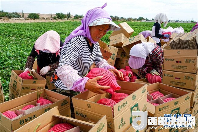 6月27日,新疆哈密市伊州區(qū)南湖鄉(xiāng)瓜農把包裝好的哈密瓜裝箱。