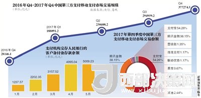 在移動(dòng)支付市場(chǎng)上,支付寶和擁有財(cái)付通、微信支付的騰訊金融雙寡頭局勢(shì)顯現(xiàn)。今年4月,易觀2017年第四季度中國(guó)第三方支付移動(dòng)支付市場(chǎng)數(shù)據(jù)顯示,第三方移動(dòng)支付市場(chǎng)交易規(guī)模為37.7萬億元,環(huán)比增長(zhǎng)27.91%。其間支付寶和騰訊金融兩巨頭的份額分別為54.26%和38.15%,合計(jì)92.41%。