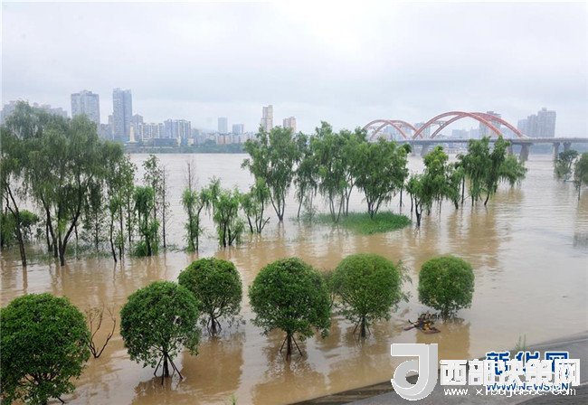 7月3日,在四川省南充市,嘉陵江南充主城區(qū)段洪峰過(guò)境,沿岸大量綠地被淹。新華社發(fā)(樂(lè)校臣 攝)