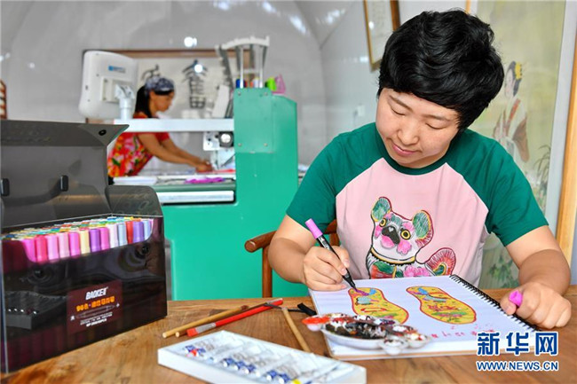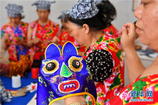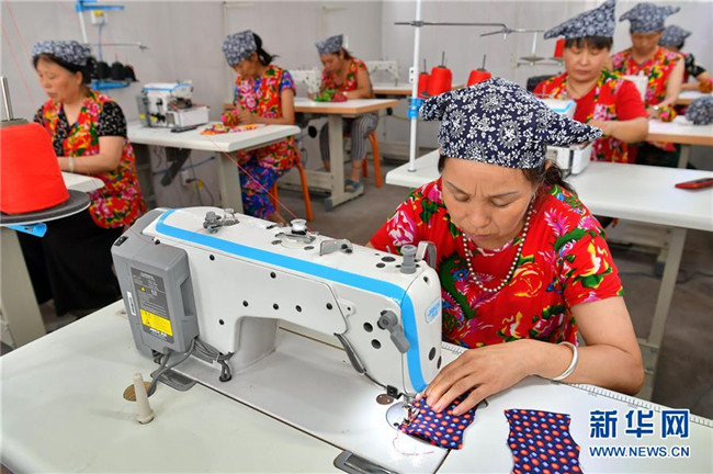 山西省臨縣寨則坪村是呂梁山上典型的貧困村。2017年5月,該村邀請(qǐng)縣里的老手藝人對(duì)10余位婦女進(jìn)行布藝加工的集中培訓(xùn),并在村委院子里建起了布藝加工廠。靠著加工富有當(dāng)?shù)靥厣男瑝|、肚兜、布老虎等工藝品,這些婦女每月能拿到1500元的工資,這幫助她們順利摘下了“窮帽子”。新華社記者 曹陽(yáng) 攝
