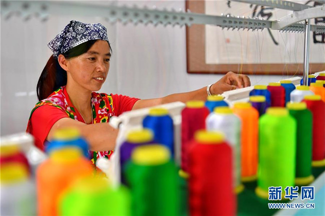 7月18日,臨縣寨則坪村的村民在用機(jī)器為布料繡花。