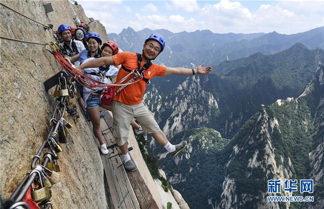 被譽(yù)為“華山第一天險(xiǎn)”的長(zhǎng)空棧道,位于陜西省華陰市五岳華山南峰東側(cè)山腰,在萬(wàn)仞絕壁上鑲嵌石釘搭木椽而筑。 由于長(zhǎng)空棧道貼崖懸空,對(duì)探險(xiǎn)獵奇者極具誘惑性和挑戰(zhàn)性,吸引歷險(xiǎn)探勝者絡(luò)繹不絕。新華社記者 陶明 攝