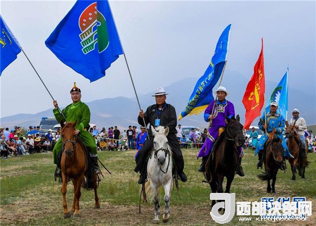 呼日查畢力格(左二)在赤峰市巴林左旗那達(dá)慕上騎馬出場(chǎng)(7月19日攝)。新華社記者彭源攝