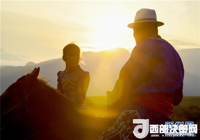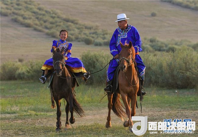 夕陽(yáng)下,呼日查畢力格在教女兒騎馬(7月20日攝)。新華社記者彭源攝
