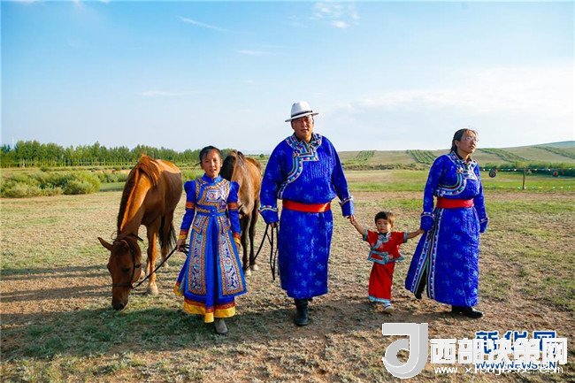 呼日查畢力格(左二)與家人牽馬走在草場(chǎng)上(7月20日攝)。新華社記者彭源攝