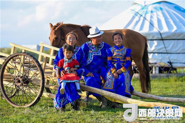 呼日查畢力格(右二)與家人坐在勒勒車(chē)前合影(7月20日攝)。新華社記者彭源攝