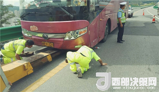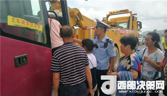 西部決策網(wǎng)-西部大開發(fā)訊(記者帥華鋒 通訊員 馬存福 蘇娟)7月31日上午,甘肅西和縣公安局交警大隊(duì)高速中隊(duì)執(zhí)勤民警巡邏至十天高速西和段上行線天水方向(西和隧道附近),發(fā)現(xiàn)一輛大客車??吭诼愤?,當(dāng)時(shí)高速行駛的車輛川流不息,車輛沒有停放在安全地帶,存在著極大的安全隱患。民警上前立即查看情況,發(fā)現(xiàn)車輛故障,67名乘客被困于高速,乘客大多數(shù)為婦女與兒童,由于天氣炎熱,長時(shí)間困于車輛中,情緒焦急不安,存在諸多不安全因素,見此情況,民警立即在故障車輛兩百米外設(shè)置安全提示牌,擺放錐桶,現(xiàn)場指揮過往車輛,提醒車輛減速慢行,做好防護(hù)的同時(shí),利用巡邏警車將車上乘客有序轉(zhuǎn)移到一公里外的停車區(qū),積極聯(lián)系高速公路救援中心將故障車輛進(jìn)行拖移,盡快撤離高速,恢復(fù)交通秩序。