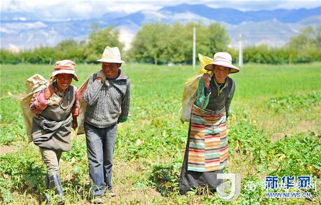 8月8日,在邊雄鄉(xiāng)普夏村蘿卜種植基地,村民將收獲的蘿卜運(yùn)向地頭。 新華社發(fā)(趙宏 攝)