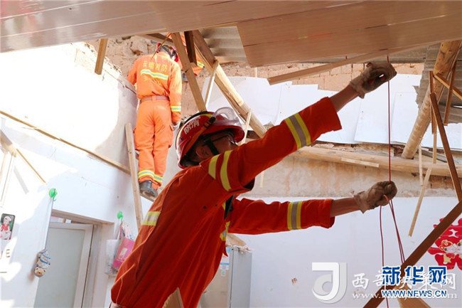 8月13日,消防隊(duì)員在清理受災(zāi)房屋。