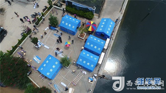 通??h四街鎮(zhèn)中搭起的救災(zāi)帳篷(8月13日無人機(jī)拍攝)。