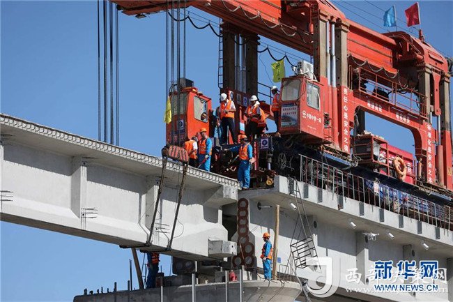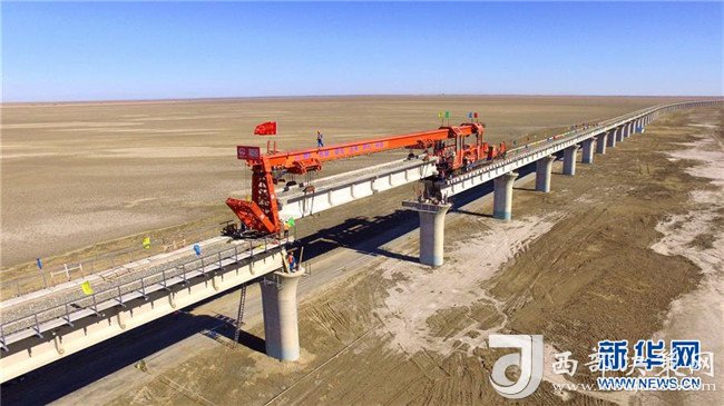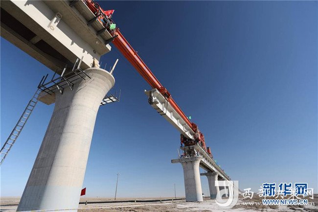 8月17日,施工人員在位于新疆若羌縣的臺特瑪湖特大橋施工現(xiàn)場作業(yè)。8月17日11時58分,在一組架橋機和運梁機的協(xié)調(diào)配合下,隨著最后一孔T型梁上的梁體精準吊裝到位,全長24.558公里、歷時2年建設(shè)的格庫鐵路(青海格爾木——新疆庫爾勒)最長鐵路橋——新疆臺特瑪湖特大橋?qū)崿F(xiàn)合龍。新華社發(fā)