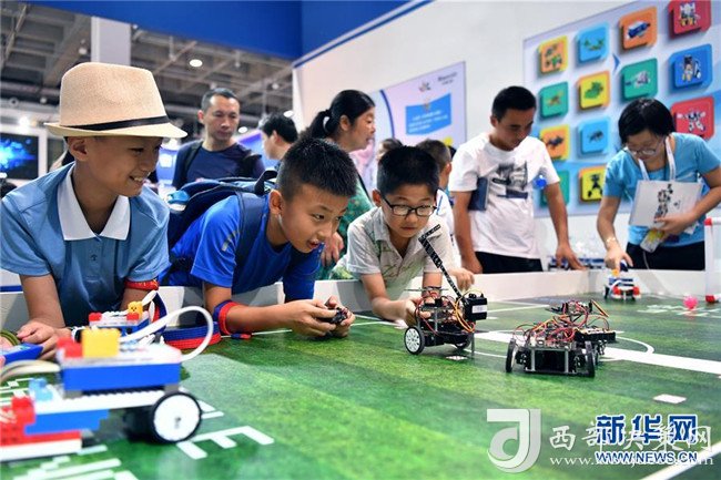 三名少年在2018世界機(jī)器人大會(huì)一處展臺(tái)體驗(yàn)編程機(jī)器人(8月15日攝)。 新華社記者 李鑫 攝