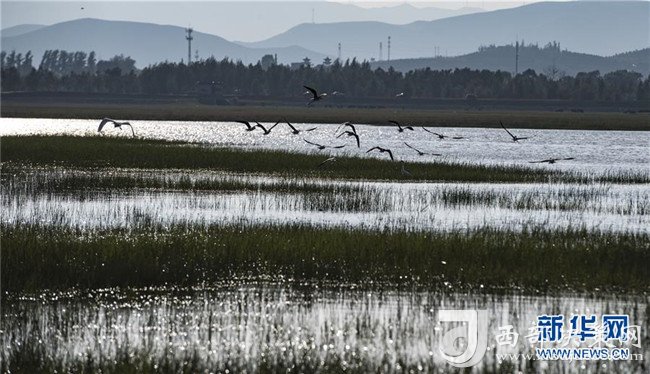 8月22日,野鳥(niǎo)在廣靈縣壺流河濕地飛翔。新華社記者 陶明 攝