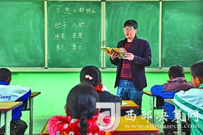 在甘肅省永靖縣小嶺鄉(xiāng)土門村土門小學(xué),校長鮮虎給一年級(jí)學(xué)生上語文課。新華社記者 范培珅攝