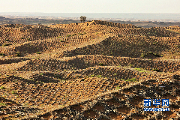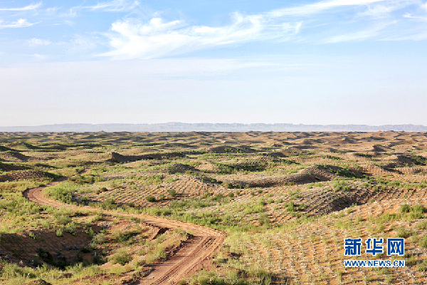 通過“麥草方格”模式組成的“沙帳植物帶”。新華網(wǎng)陳延特?cái)z