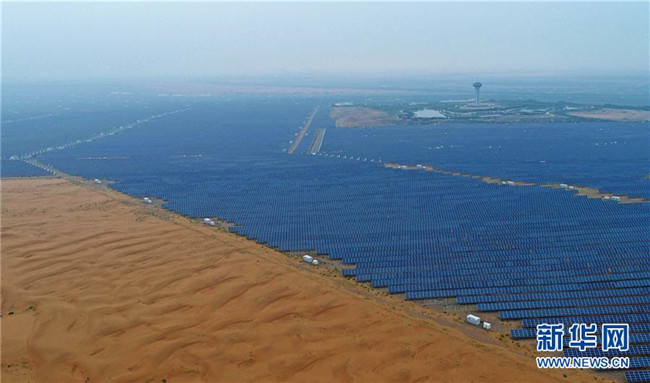 寧夏中衛(wèi)市沙漠光伏產(chǎn)業(yè)園光伏電站(8月31日無人機(jī)拍攝)。新華社記者王鵬攝
