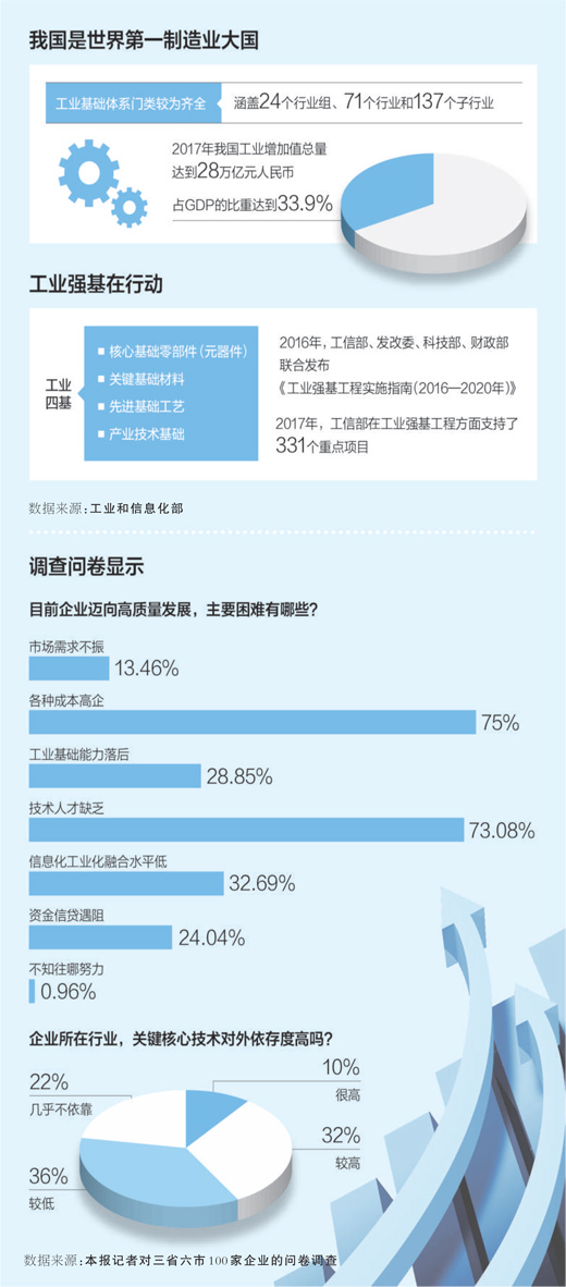 “要實(shí)現(xiàn)從‘有’到‘好’的轉(zhuǎn)變,在高端產(chǎn)品上突破,還需要時(shí)間。”調(diào)查中企業(yè)坦言,我國(guó)部分核心技術(shù)、關(guān)鍵產(chǎn)品和重大裝備仍存瓶頸制約,一些工業(yè)產(chǎn)品在一致性、穩(wěn)定性和使用壽命方面與國(guó)外先進(jìn)水平差距較大,工業(yè)基礎(chǔ)須進(jìn)一步夯實(shí)。